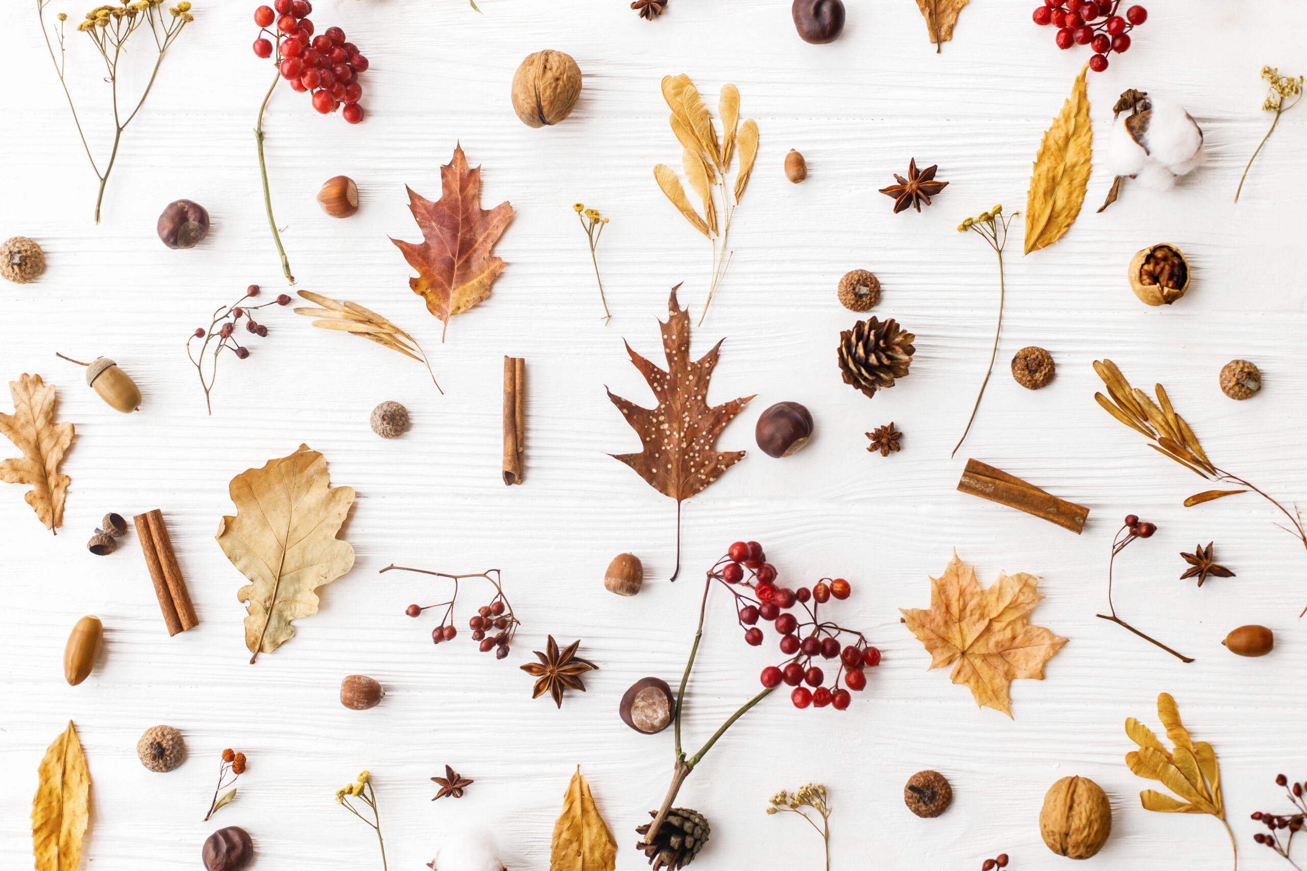 Fall leaves, berries, acorns, walnuts, cinnamon and anise on whi